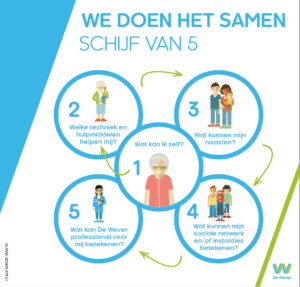Dit vraagt om een actieve rol van jou én van je naasten. Samen kijken we wie wat kan bijdragen aan jouw ondersteuning en begeleiding. Om dat gesprek goed te voeren, werkt De Wever met De Schijf van 5: een hulpmiddel waarmee we samen helder krijgen wie welke rol speelt, en hoe we jouw zelfstandigheid zo goed mogelijk ondersteunen.